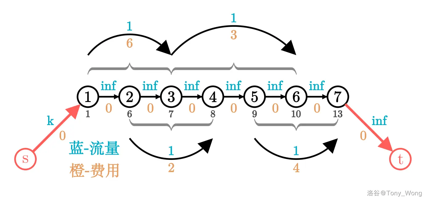 对于每个点, 自己的入点连接自己的出点, 容量为 \(1\), 费用为 \(1\), 起点和终点的容量为 \(2\),